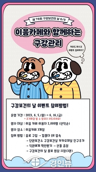 이벤트는 스마트폰 어플을 이용한 ‘6월 걷9 건치되자’ 걷기챌린지와 이음카페에서 음료구입 후 컵홀더에 있는 QR코드를 이용한 카카오톡채널 친구추가 및 구강건강관리 영상 시청 등을 운영하며 참여자에게는 홍보물품도 증정한다.