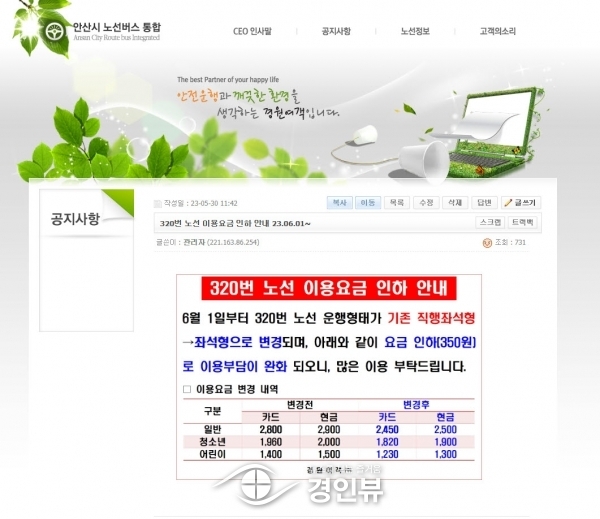 (경인뷰) 안산시는 안산에서 여의도를 오가는 301번, 320번 2개 노선 운행계통 변경을 통해 지난 1일부터 시내버스 요금을 350원 인하했다고 8일 밝혔다.