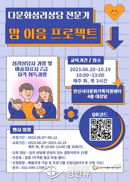 (경인뷰) 안산시 다문화가족지원센터는 이달 20일부터 다문화심리상담 전문가 양성과정을 운영한다고 8일 밝혔다.