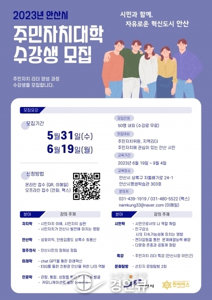 (경인뷰) 안산시는 지방자치를 선도할 지역리더 양성을 위해 ‘2023년 안산시 주민자치대학’ 수강생을 모집한다고 9일 밝혔다.