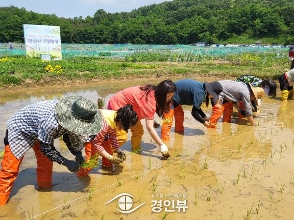 (경인뷰) 안산시는 단원 주말농장에서 지난 6일 도시농업 주말농장 경작가족 및 도시농업공동체 회원 20여명과 함께 전통모내기 체험을 진행했다고 9일 밝혔다.