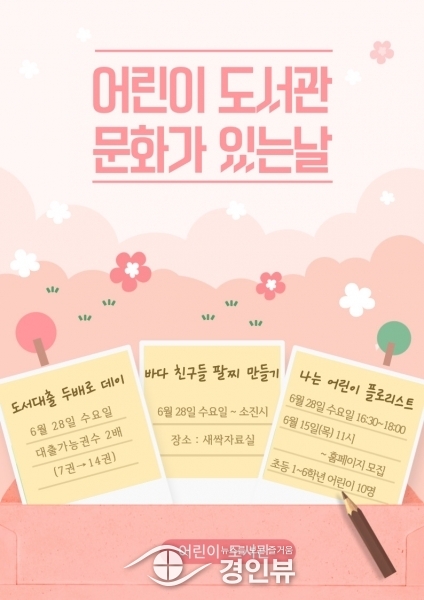 6월 문화가 있는 날에는 1인당 도서 대출 권수가 기존 7권에서 14권까지 확대되는 도서대출 두배로 데이, 바다 친구들이 그려진 팔찌를 직접 색칠하며 나만의 예쁜 팔찌를 만들어보는 바다 친구들 팔찌 만들기, 어린이들이 직접 플로리스타가 되어 꽃바구니를 만들어보는 나는 어린이 플로리스트프로그램을 진행한다.