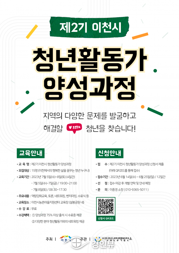 (경인뷰) 이천청년정책발전소는 6월 25일까지 ‘제2기 이천시 청년활동가 양성과정 교육’에 참여할 청년을 모집한다고 밝혔다.