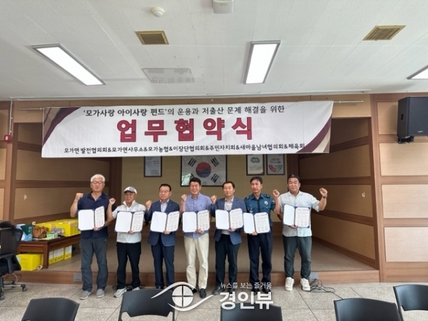 (경인뷰) 모가면 발전협의회은 지난 27일에 모가면 행정복지센터에서 ‘모가사랑 아이사랑 펀드’ 사업의 활성화를 위해 관내 7개 기관·사회단체와 업무 협약식을 체결했다고 밝혔다.