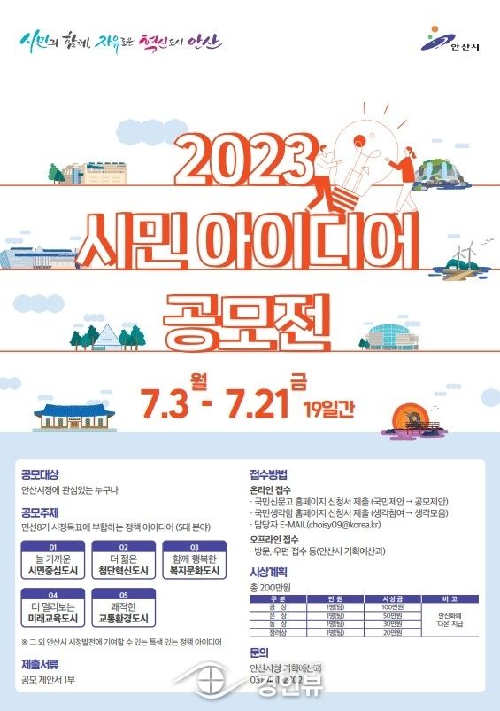 (경인뷰) 안산시는 민선8기 출범 1주년을 맞아 이달 3일부터 오는 21일까지 ‘2023년 시민 아이디어 공모전’을 개최한다고 6일 밝혔다.