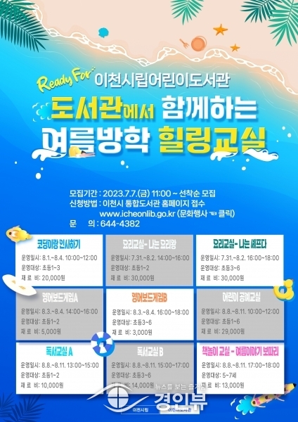 (경인뷰) 이천시립어린이도서관은 7월 31일부터 8월 11일까지 여름방학을 맞이한 어린이들에게 다양한 교육 기회를 제공하고 방학기간 도서관 이용 활성화를 위해 2023년 이천시립어린이도서관과 함께하는 ‘여름방학 힐링 교실’ 프로그램을 운영한다.