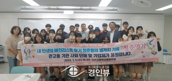 (경인뷰) 이천시 관고동주민자치평생학습센터는 내 인생의 버킷리스트 청춘들의 열 가지 기록 ‘청춘열기 응원프로젝트’로 관고동 기관사회단체와 기업이 함께 다산고등학교 봉사동아리학생 24명의 꿈을 응원하는 뜻깊은 시간을 마련했다고 밝혔다.