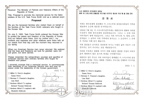 유족들은 건의서를 통해 “스미스 부대는 대한민국 평화와 자유를 수호하기 위해 한국전쟁에 참전했다”며 “대한민국 정부 주도로 참전용사들의 희생을 기리고 평화를 기원하는 추도식을 진행해주기를 바란다”고 밝혔다.