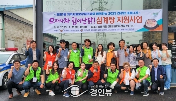 (경인뷰) 광주시 오포1동 지역사회보장협의체는 11일 건강한 여름나기를 위해 취약계층 어르신 150명을 대상으로 ‘으라차차 힘이난닭’ 삼계탕 식사 지원 및 이웃돕기 후원물품 전달식을 개최했다.