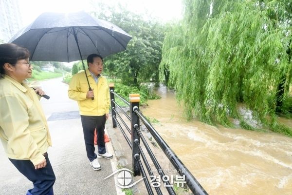 (경인뷰) 이권재 오산시장이 13일 수도권 집중호우에 대비해 신장빗물펌프장, 대영주택, 오산대학교 앞 징검다리 등 집중침수 지역 등을 찾아 수해 대비 상황을 점검했다.