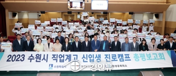 (경인뷰) 수원특례시의회 김기정 의장, 이재식 부의장을 비롯한 유준숙 기획경제위원장, 장정희·윤명옥 의원이 7월 17일 시청 대강당에서 열린 ‘2023 수원특례시 직업계고 진로캠프 총평 보고회’에 참석했다.
