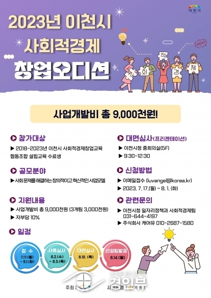 (경인뷰) 이천시는 올해 처음으로 2023 이천시 사회적경제 창업오디션 참가자를 7월17일부터 8월1일 오후 3시까지 모집한다.