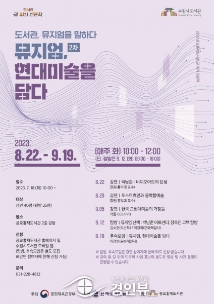 (경인뷰) 수원시 광교홍재도서관이 2023년 길 위의 인문학 ‘도서관, 뮤지엄을 말하다 : 2차 뮤지엄, 현대미술을 담다’ 수강생 40명을 18일 오전 10시부터 선착순으로 모집한다.