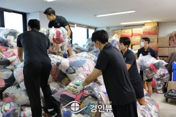 선수들은 4층 사무실에 수북이 쌓인 아동의류를 2층으로 옮기고 박스를 가지런히 정리하면서 비지땀을 흘렸다.