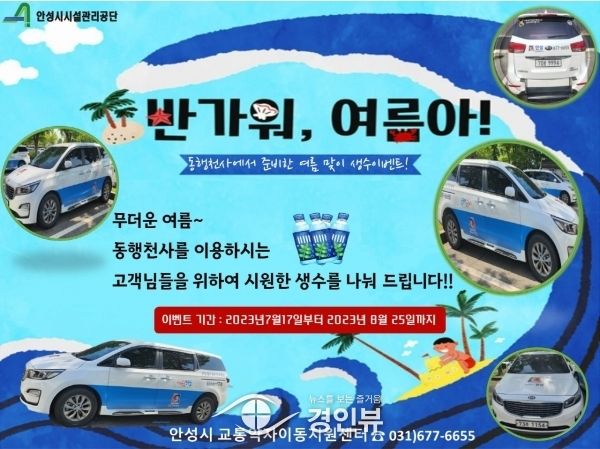 (경인뷰) 안성시시설관리공단 교통약자이동지원센터에서 오는 7월 17일부터 8월 25일까지 생수 나눔 이벤트를 실시한다고 밝혔다.