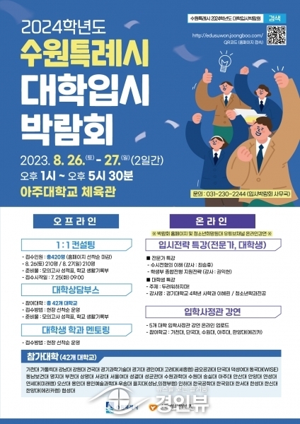 (경인뷰) 수원시가 8월 26일~27일 아주대학교 체육관에서 고등학교 3학년 수험생과 학부모를 대상으로 ‘2024학년도 대학입시박람회’를 개최한다.