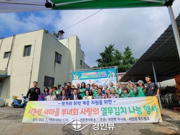 (경인뷰) 서운면 부녀회에서는 서안성푸드뱅크와 함께 서운면사무소에서 지난 7월 19일 김치보릿고개 해결을 위한 사랑의 열무김치 나눔 행사를 가졌다.