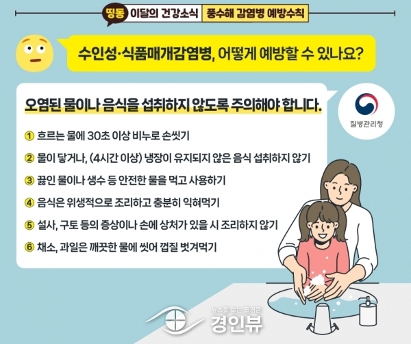특히 장티푸스, 세균성 이질, A형 간염 등 오염된 물이나 음식을 섭취해 발생하는 수인성·식품매개 감염병 예방을 위해 흐르는 물에 30초 이상 비누로 손 씻기 음식물 충분히 가열해 섭취하기 조리한 음식은 오래 보관하지 않기 설사 증상이나 손에 상처가 있는 경우 조리하지 않기 범람한 물이 닿거나 냉장에서 보관되지 않은 물·음식 등은 섭취하지 않아야 한다.