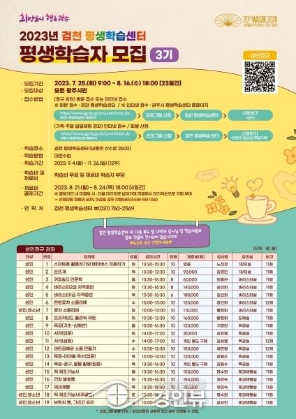 (경인뷰) 광주시 검천평생학습센터는 25일부터 다음달 16일까지 23일간 광주시민 대상 평생학습 프로그램의 수강생을 모집한다고 21일 밝혔다.