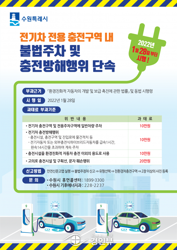 (경인뷰) 수원시가 전기차 전용 충전 구역 내 불법주차와 충전방해행위에 대한 단속·홍보를 강화한다.
