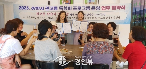 (경인뷰) 이천시 관고동평생학습센터는 지역 특성화 프로그램으로 평생학습 주간 평생학습 Day 운영을 위한 “난 학습하러 우리동네 카페로 간다” 카페학습 운영을 위해 관내 카페대표 5명과 업무 협약식을 개최했다.