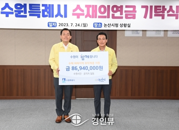 (경인뷰) 이재준 수원특례시장이 자매도시인 논산시를 방문해 수원시민, 공직자, 협업기관 직원들이 모금한 수해복구 성금을 전달했다.