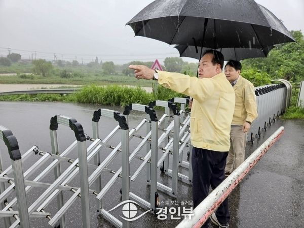 (경인뷰) 이권재 오산시장이 지난 23일 호우 특보 발표에 따라 오산천 출입 통제 현장을 직접 둘러보았다.