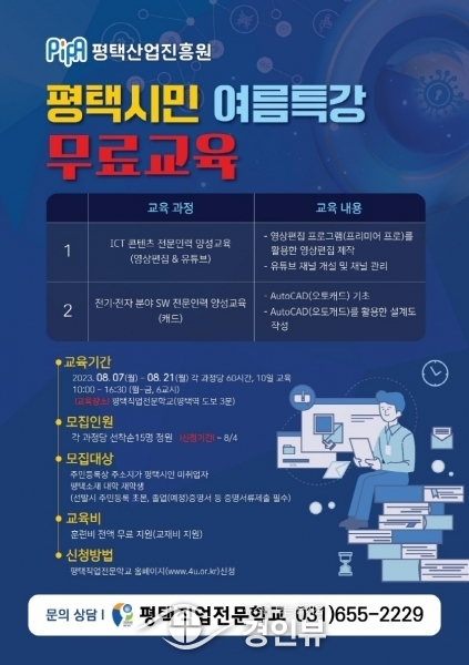 각 과정은 오는 8월 4일까지 선착순으로 15인의 교육생을 모집하며 진흥원 누리집 및 평택직업전문학교 누리집을 통해 교육을 신청할 수 있다.