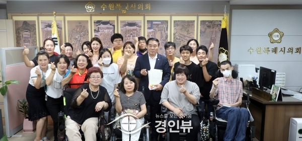 (경인뷰) 이재식 수원특례시의회 부의장은 25일 소담장애인자립생활센터‘권리중심 중증장애인 맞춤형 공공일자리’사업 참여자들에게 특별한 엽서를 전달받고 소통의 시간을 가졌다.