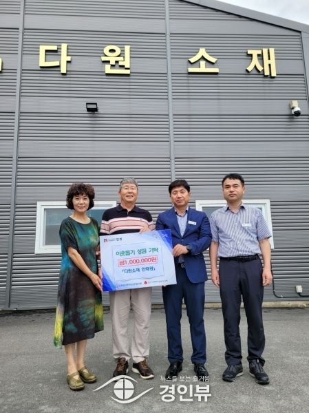 (경인뷰) 안성시 일죽면에 위치한 다원소재는 지난 26일 일죽면행정복지센터를 방문해 이웃돕기 성금 100만원을 기부했다.