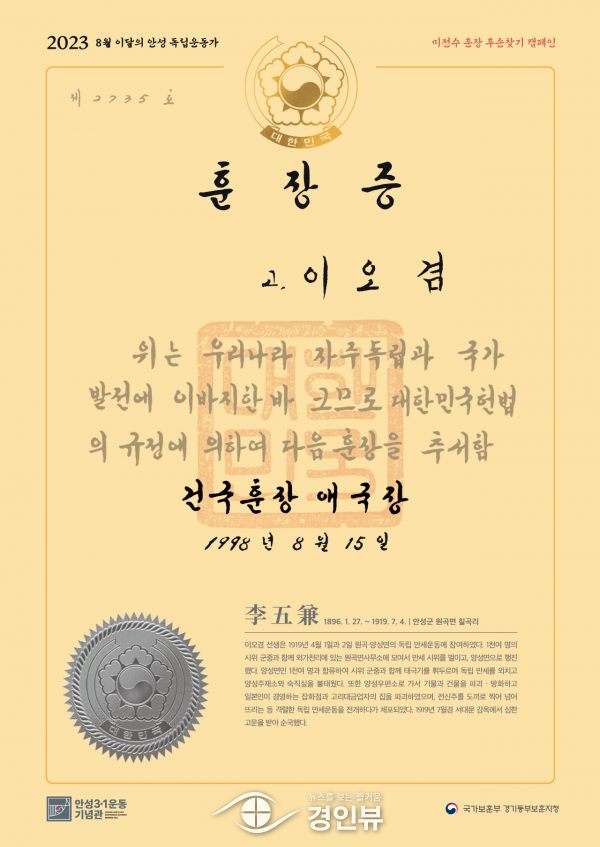 (경인뷰) 안성시와 경기동부보훈지청은 공동으로 2023년 8월 이달의 안성 독립운동가로 이오겸 선생을 선정했다.