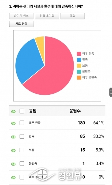 ‘센터 시설과 환경 만족도’는 ‘매우 만족’이 64.1%, ‘만족’이 30.2%였다.