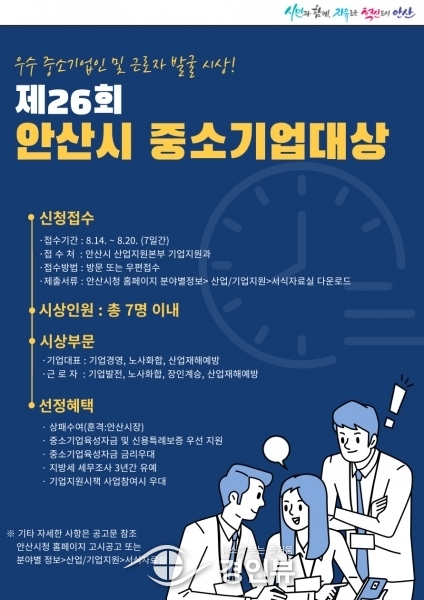 (경인뷰) 안산시는 기업경쟁력을 높이고 지역경제 발전에 노력해온 중소기업 경영인과 근로자를 발굴해 ‘안산시 중소기업 대상’을 수여한다.