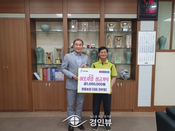 (경인뷰) 이천시 장호원읍 소재 영풍농장은 최근 발생한 집중호우에 따른 피해 복구를 위해 7월 28일 장호원읍에 성금 100만원을 기탁 했다.