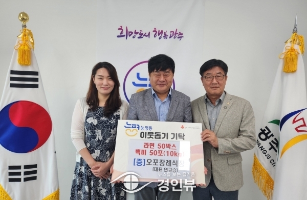 오포장례식장가 26일 라면 50박스와 백미 50포 등 250만원 상당의 이웃돕기 물품을 기탁했으며 ㈜두원포장건설과 농업회사법인 ‘100년축산’도 각각 100만원씩 성금을 기탁했다.