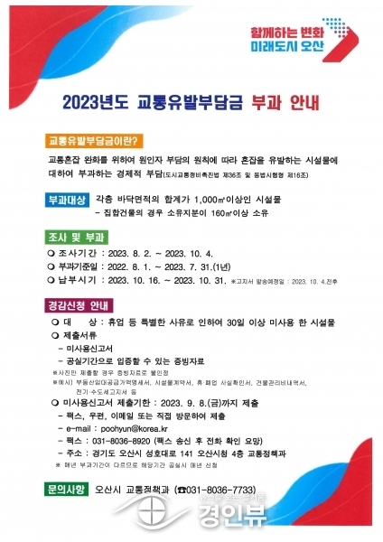 (경인뷰) 오산시가 8월 2일부터 10월 4일까지 2023년도 교통유발부담금 부과 대상이 되는 시설물에 대한 전수조사에 나선다.