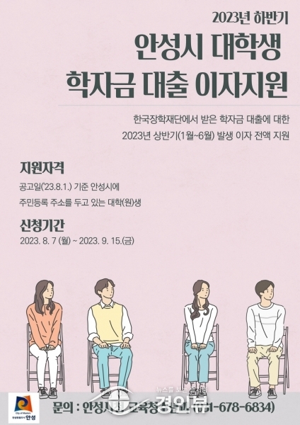 (경인뷰) 안성시는 오는 8월 7일부터 9월 15일까지 ‘2023년도 하반기 안성시 대학생 학자금 대출이자’ 지원 신청을 받는다.