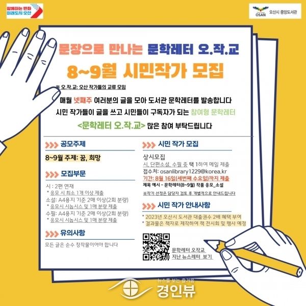(경인뷰) 오산시 중앙도서관은 시민들이 쓴 글을 매달 2회씩 발송하는 간행물, ‘문학레터 오·작·교’에 참여할 시민 작가를 오는 16일까지 모집한다고 밝혔다.