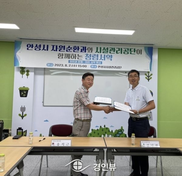(경인뷰) 안성시 자원순환과는 지난 2일 관내 안성시시설관리공단과 재활용 홍보교육관에서 청렴 서약에 서명하고 서약서를 교환하는 자체 청렴 행사를 추진했다고 밝혔다.