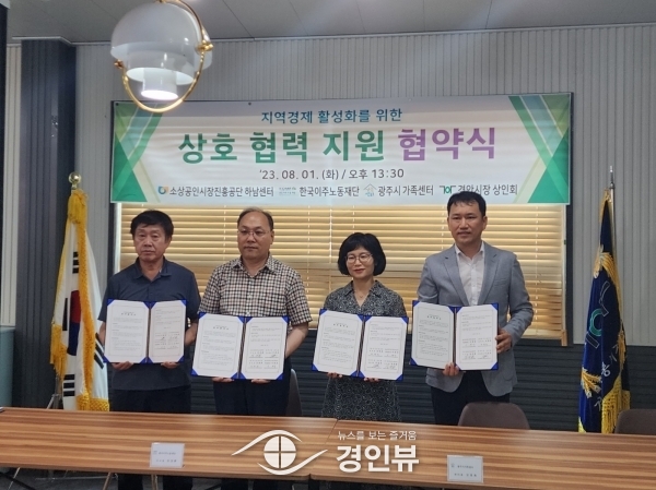 (경인뷰) 광주시 경안시장 상인회는 지난 1일 지역경제 활성화를 위해 한국이주노동재단, 광주시가족센터, 소상공인시장진흥공단 하남센터와 업무협약을 체결했다.