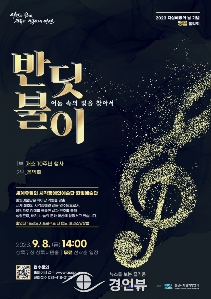 (경인뷰) 안산시 자살예방센터는 자살예방의 날을 맞아 다음달 8일 ‘반딧불이-어둠 속의 빛을 찾아서’ 앵콜 음악회를 개최한다고 4일 밝혔다.