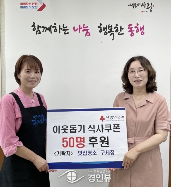 (경인뷰) 오산시 세교동에 소재한‘맛집명소 구세정’이 지난 3일 세마동을 방문해 관내 저소득 아동들에게 전달해 달라며 식사 쿠폰을 후원했다.
