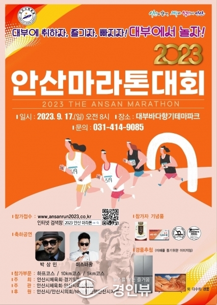 (경인뷰) 안산시는 시민들의 건강한 여가활동 및 생활체육 활성화를 위해 ‘2023 안산마라톤대회’를 오는 9월 17일 대부바다향기테마파크 일원에서 개최한다고 7일 밝혔다.