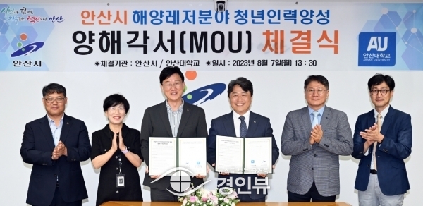 (경인뷰) 안산시는 미래형 해양레저분야의 청년전문인력 양성을 위해 레저스포츠케어 전문인력을 배출하고 있는 안산대학교와 협력과제 수립 및 이행방안 마련을 위한 업무협약을 지난 7일 체결했다고 8일 밝혔다.