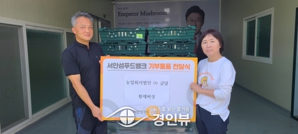 (경인뷰) 서안성푸드뱅크는 8월 7일 경기도 안성시 일죽면에 위치한 농업회사법인 ㈜금당과 기부물품 전달식을 진행했다.