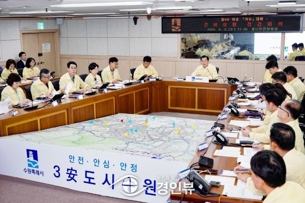 긴급대책회의에서는 수원시 태풍피해 우려 지역에 대한 부서별 사전 점검 상황을 공유했다.