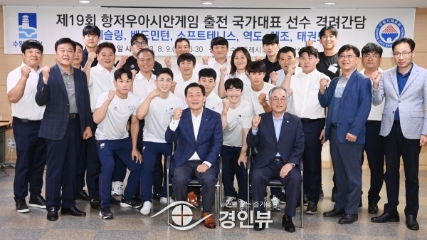 (경인뷰) 이재준 수원특례시장은 9일 의회 세미나실에 제19회 항저우아시안게임에 출전하는 수원시 소속 선수단을 초청해 격려하고 선수 1인당 100만원의 격려금을 전달했다.