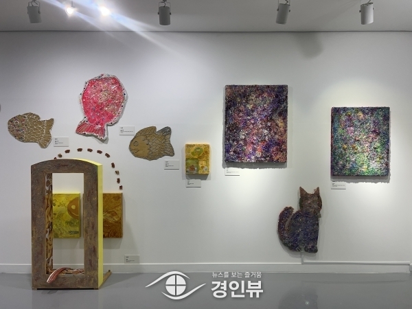 감자칩 이미지를 콜라주와 여러 물체를 한데 모아 미술 작품을 제작하는 기법인 아상블라주 방식으로 표현한 ‘감자칩 월드컵’과 국내 문구점에서 쉽게 구할 수 있는 재료들을 설치 작품 형태로 제작한 신작 ‘브라우니’, ‘트리 하우스’ 등을 선보인다.