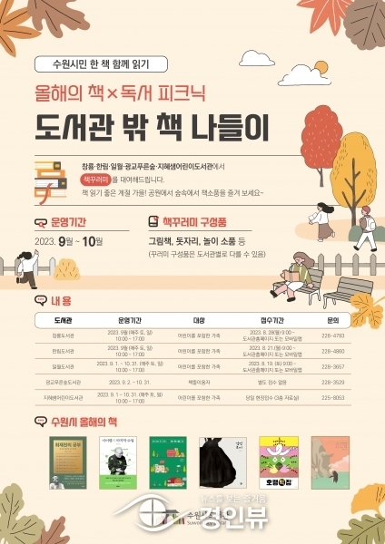(경인뷰) 수원시가 ‘수원시민 한 책 함께 읽기’ 프로그램인 ‘올해의 책×독서 피크닉, 도서관 밖 책 나들이’를 운영한다.