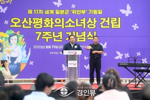 (경인뷰) 오산시와 오산평화의소녀상이 지난 11일 오산시청 광장에 마련된 평화의소녀상 앞에서 건립 7주년 기념식을 개최했다.